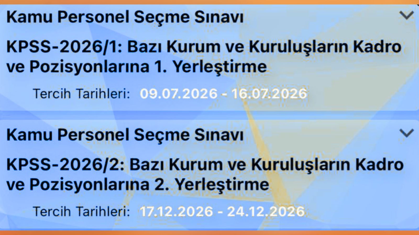 Açıklamaya göre, KPSS 2026/1 merkezi yerleştirme tercihleri 9 – 16 Temmuz 2026 tarihleri arasında alınacak. Yılın ikinci merkezi yerleştirmesi olan KPSS 2026/2 tercihleri ise 17 – 24 Aralık 2026 tarihleri arasında yapılacak.