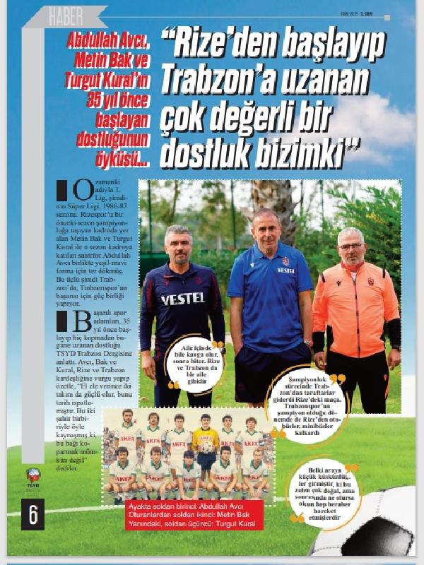 Rizespor eski futbolcusu, TÜFAD Trabzon Şube Başkanı, Trabzonspor Altyapı Koordinatör Yardımcısı Metin Bak da, “Ben Trabzonspor’dayken çok teklif vardı, ama Rizespor’a söz vermiştim. Transfer döneminde daha yüksek rakamlar verdiler ama tereddütsüz Rize’ye gittim. O tarihten beri Rize’den hiç kopmadım. Oraya gidince hiç yabancılık çekmedim. Sanki aynı ildeymiş gibiydim çünkü kültürü, doğası, her şeyi aynı. İnsanı da! Birden sinirlenir ama vefalı, neşeli, yardımseverdir. Birbirinden gelin alıp vermiş, tek yürek olmuştur bu şehirler, komşudan öte bana göre tek yürektir. Rizespor’un şampiyon olup 1. Lige (şimdiki Süper Lig) yükseldiğinde Trabzonlu olarak ben, Turgut Kural ve Erol Tombul takımdaydık. Bizi evlatları gibi görür severlerdi, halen aynı dostluklar sürüyor. Şampiyonluk sürecinde Trabzon’dan taraftarlar gelirdi maçlara. Trabzonspor’un şampiyon olduğu dönemde de Rize’den otobüsler, minibüsler kalkardı. El ele verince iki takım da güçlü olur, bunu tarih ispatlamıştır. Başarı için yine öyle olmalı. Abdullah Avcı ve Turgut Kural’la birlikte 1986-87 sezonunda birlikte oynadık. Kamplarda, antrenman dışında hep beraberdik. Turgut Kural’la uzun yıllar her şeyi paylaştık. Abdullah Avcı hep paylaşımcı katılımcı, değerli bir kişilikti. 35 yıl geçti, o süre içinde birbirimizden hiç kopmadık. Her durumda birbirimize destek olduk. Turgut çok yetenekli, çalışkan bir oyuncuydu. Abdullah Avcı ise iyi bir golcüydü, bitiriciydi. Oyun zekâsı çok yüksek, iyi pozisyon alırdı. Kafa hâkimiyeti de çok yüksekti” diye konuştu.