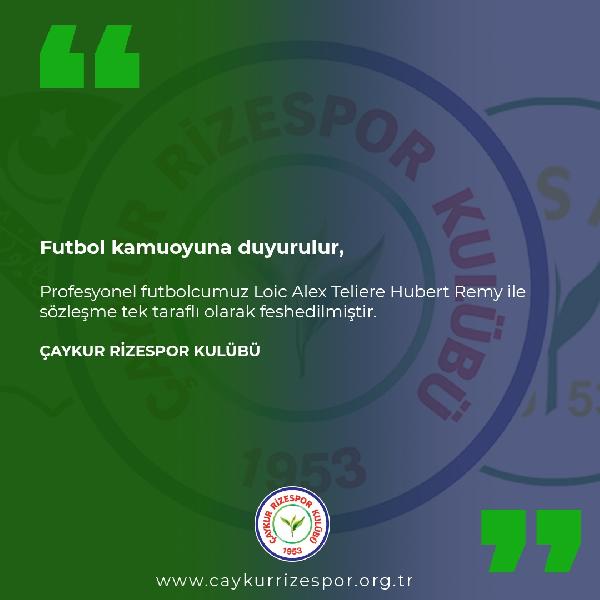 Çaykur Rizespor, Loic Alex Teliere Hubert Remy ile sözleşmesini tek taraflı olarak feshetti. Yeşil-mavili kulüpten yapılan yazılı açıklamada “Profesyonel futbolcumuz Loic Alex Teliere Hubert Remy ile sözleşmetek taraflı olarak feshedilmiştir” denildi.