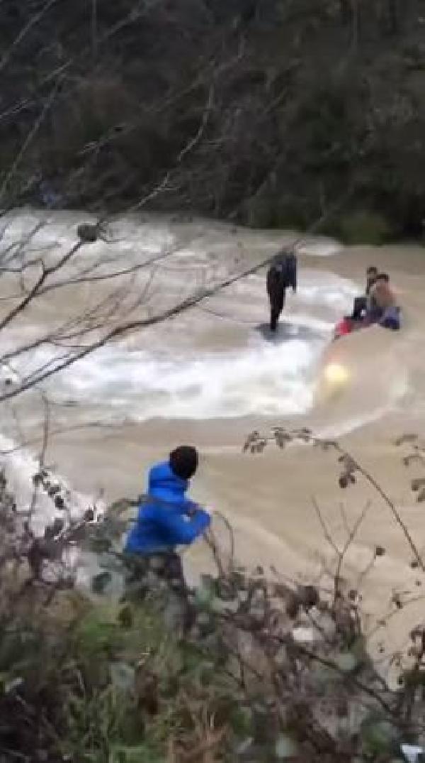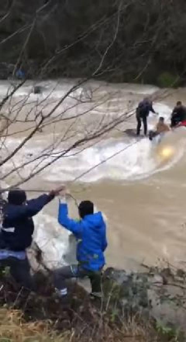 Bu arada su debisi yükselen deredeki kurtarma anları ise cep telefonu kamerasına yansıdı. Görüntülerde, 3 kişinin, vatandaşlar ve çevredeki sürücülerin yardımıyla son anda kurtuldukları yer aldı.