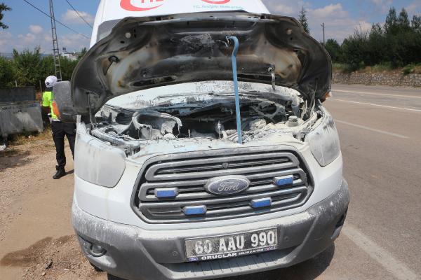 Tokat'tan Samsun'a hasta sevk eden ambulans, seyir halindeyken motor bölümünde yangın çıktı. Ambulans şoförü Efkan Bişgin'in zamanında müdahalesiyle yangın büyümeden söndürüldü.