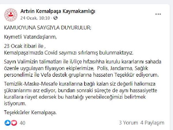 Paylaşımda “Kemalpaşamızda Covid sayımızı sıfırlamış bulunmaktayız. Sayın Valimizin talimatları ile il/ilçe hıfzısıhha kurulu kararlarını sahada özenle uygulayan filyasyon ekiplerimize, polis, jandarma, sağlık personelimiz ile vefa destek gruplarına hassaten (özellikle) teşekkür ediyorum. Temizlik-maske- mesafe kurallarına bağlı kalan siz değerli halkımıza şükranlarımı arz ediyor, bundan sonraki süreçte de aynı hassasiyette kurallara riayet edersek bu hastalığı yenebileceğimizi belirtmek istiyorum. Teşekkürler Kemalpaşa” ifadelerine yer verildi.