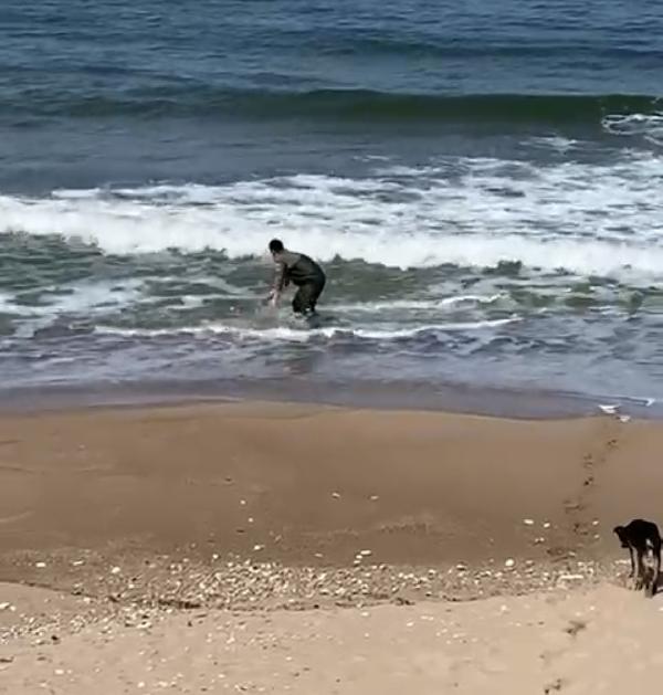 BARTIN’ın Kurucaşile ilçesinde Hüseyin Fırtına, sahile vuran yunusu kuyruğundan tutup denize sürükleyerek kurtardı.