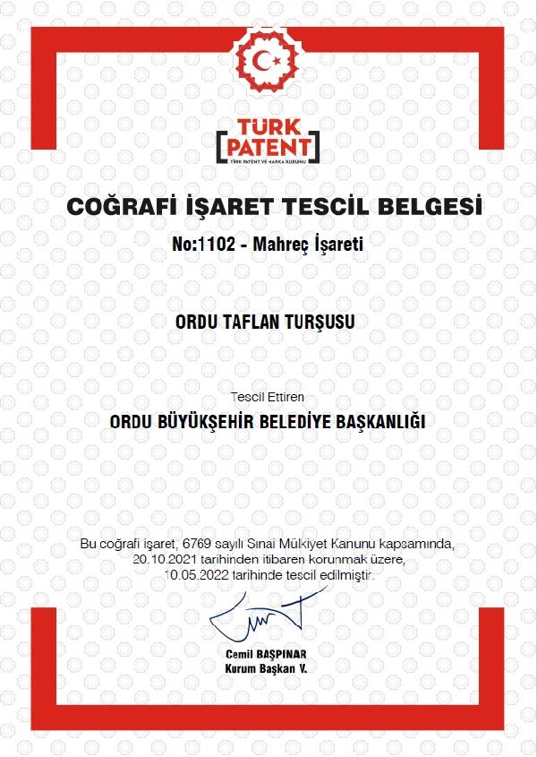 Ordu Büyükşehir Belediyesi Tarım ve Hayvancılık Hizmetleri Dairesi Başkanlığı’nın girişimleriyle Ordu Tostu ve Yalıköy Köftesinin ardından 'Ordu Taflan Turşusu' da coğrafi işaret aldı. Ordu Taflan Turşusu, Türk Patent ve Marka Kurumunun 16 Mayıs 2022 ve 125 sayılı Resmi Coğrafi İşaret ve Geleneksel Ürün Adı Bülteninde yayımlanarak mahreç işaretli ürün olarak tescillendi. Ordu Taflan Turşusunun coğrafi işaret almasının ardından il genelindeki coğrafi işaret tescili yapılan ürün sayısı 8’e çıktı. Daha önce Kabataş Helvası, Perşembe Ceviz Helvası, Ordu Yayla Pancarı (Dürme) Turşusu, Akkuş Şeker Fasulyesi, Ordu Kivisi, Ordu Tostu ve Yalıköy Köftesi tescillenmişti.