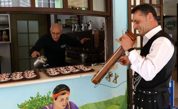TRABZON'un Sürmene ilçesinde bir çay fabrikasında çalışan Coşkun Çınar (56), kemençe eşliğinde horon tepip, çay servisi yapıyor. Çay tutkusu ile sosyal medyada da ilgi gören Çınar, "Hem çay içip mutlu oluyorum hem de kemençe ve horonla enerji doluyorum. Enerjimi çaydan alıyorum. Çay içtiğim zaman fıkır fıkır oluyorum" dedi.
