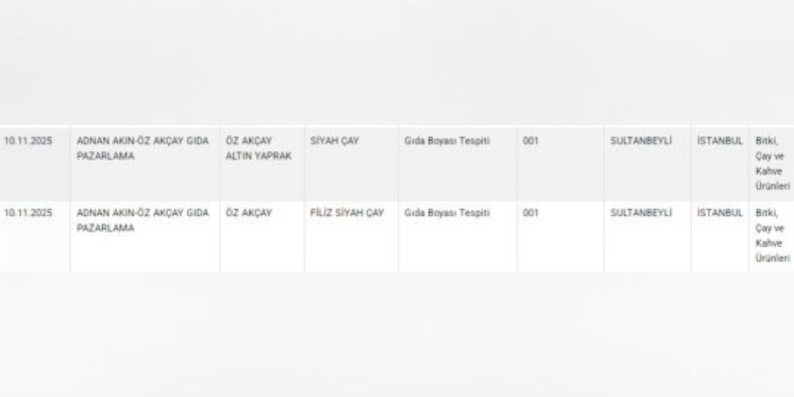 Bakanlık verilerine göre, İstanbul Sultanbeyli merkezli Adnan Akın - Öz Akçay Gıda Pazarlama firmasının “Öz Akçay Altın Yaprak” ve “Öz Akçay” markalı siyah çaylarında gıda boyası tespit edildi.