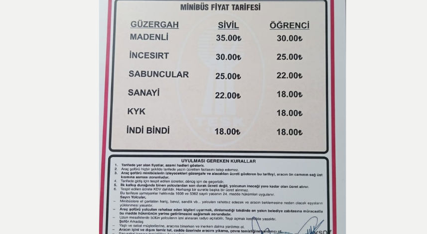 Buna göre, Çayeli'nden Madenli 35 TL, İncesırt 30 TL, Sabuncular 25 TL, Sanayi 22 TL ve KYK güzergahı 18 TL olarak belirlendi.