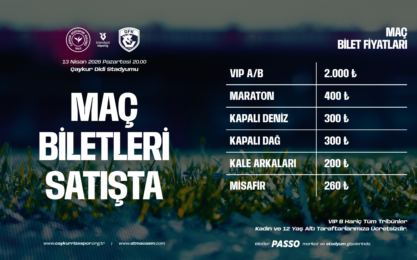 Çaykur Rizespor'un, Trendyol Süper Lig'in 29. haftasında oynayacağı Gaziantep FK maçının biletleri satışa sunuldu.