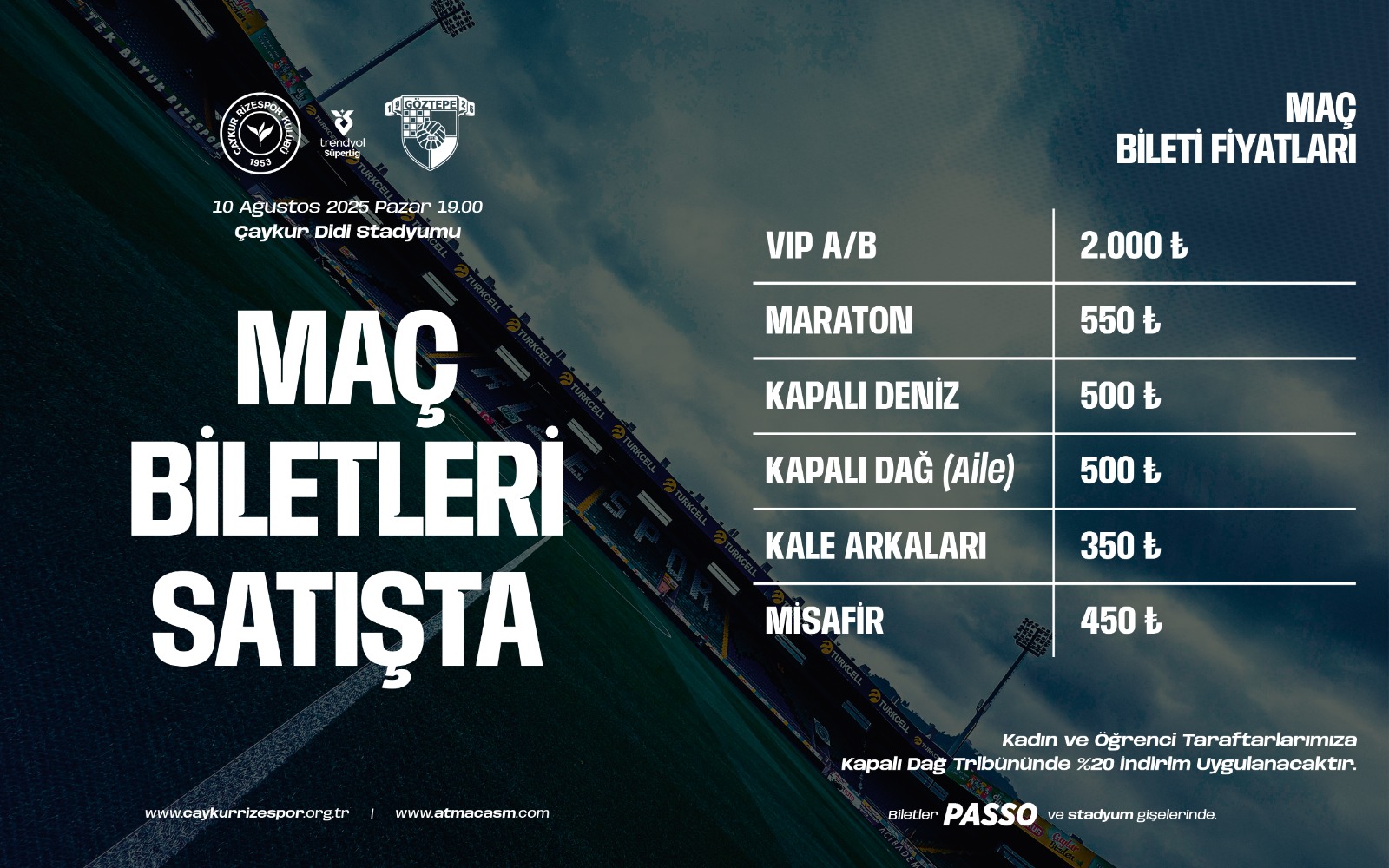 Trendyol Süper Lig'in ilk haftasında heyecan dorukta! 10 Ağustos 2025 Pazar günü saat 19.00'da Çaykur Didi Stadyumu'nda oynanacak olan Çaykur Rizespor - Göztepe maçının biletleri satışa sunuldu.