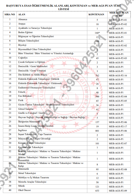 10 bin öğretmen alımına ilişkin branş bazlı kontenjan dağılımı da başvuru kılavuzunda yayımlandı. Adaylar, kendi alanlarına ait kontenjan sayılarına ve başvuru detaylarına kılavuz üzerinden ulaşabilecek.