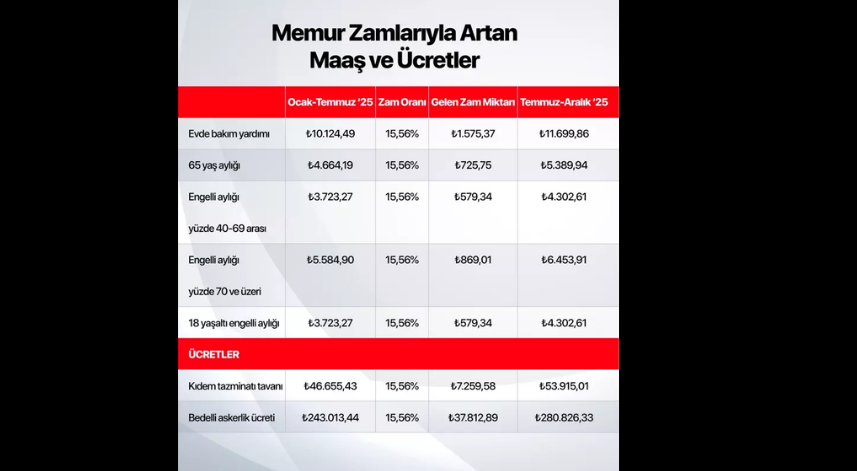 Temmuz ayı itibarıyla memur maaşlarına yapılan %15,56 oranındaki artış, birçok kalemde ödemelere yansıdı. Bu kapsamda engelli aylığı, 65 yaş aylığı, evde bakım yardımı, kıdem tazminatı tavanı ve bedelli askerlik ücreti de zamlandı.