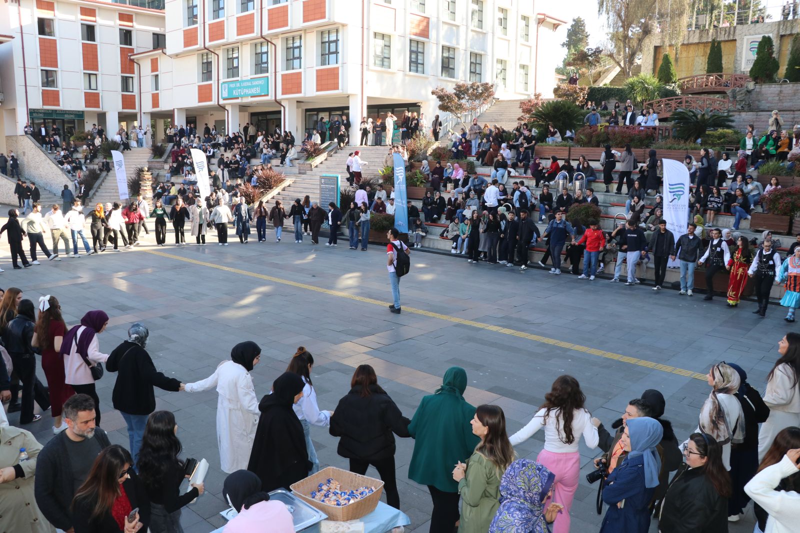 Renkli görüntülerin oluştuğu şenliğe katılan Prof. Dr. Yusuf Yılmaz, öğrencilerin daveti üzerine horona katıldı.