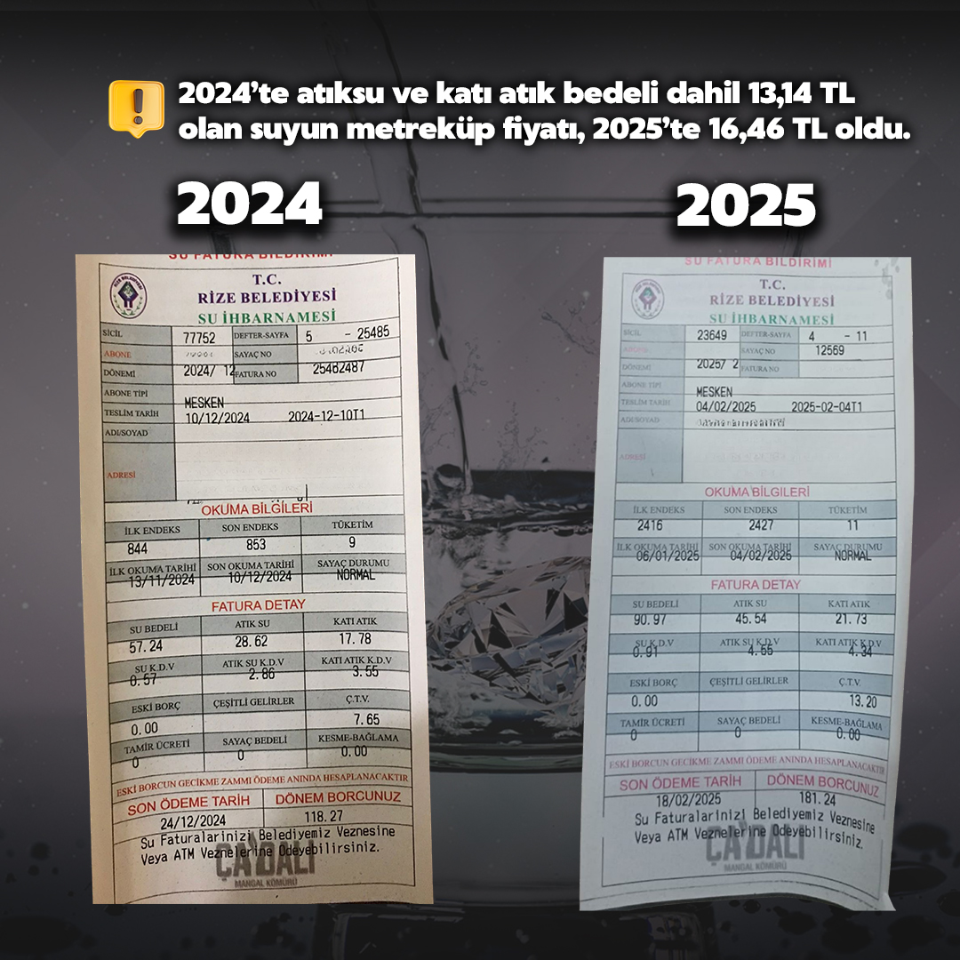 Rize Belediye Meclisi tarafından 2024 yılı için belirlenen 1 metreküp su fiyatının 13,14 TL olduğu belirtilirken, bu fiyata atık su hizmet bedeli, katı atık toplama hizmeti, çevre temizlik vergisi ve KDV'nin dahil olduğu ifade edildi. Belediye meclisinin aldığı kararla fiyat güncellemesi doğrultusunda, 1 Ocak itibarıyla suyun metreküp fiyatı 16,46 TL olarak belirlendi.