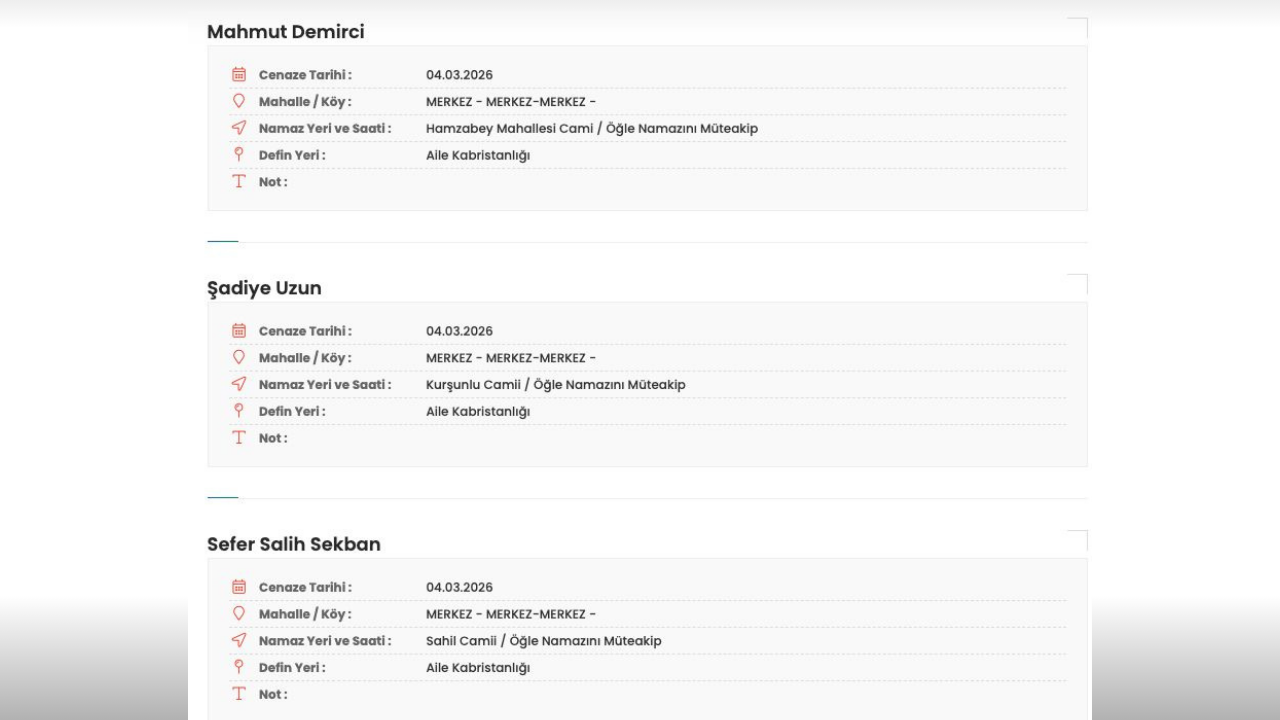 Rize’de bugün vefat eden vatandaşların cenaze bilgileri belli oldu. 4 Mart 2026 tarihinde Rize Merkez’de hayatını kaybeden üç vatandaşın cenazeleri öğle namazının ardından kılınacak cenaze namazı sonrası aile kabristanlıklarında toprağa verilecek.