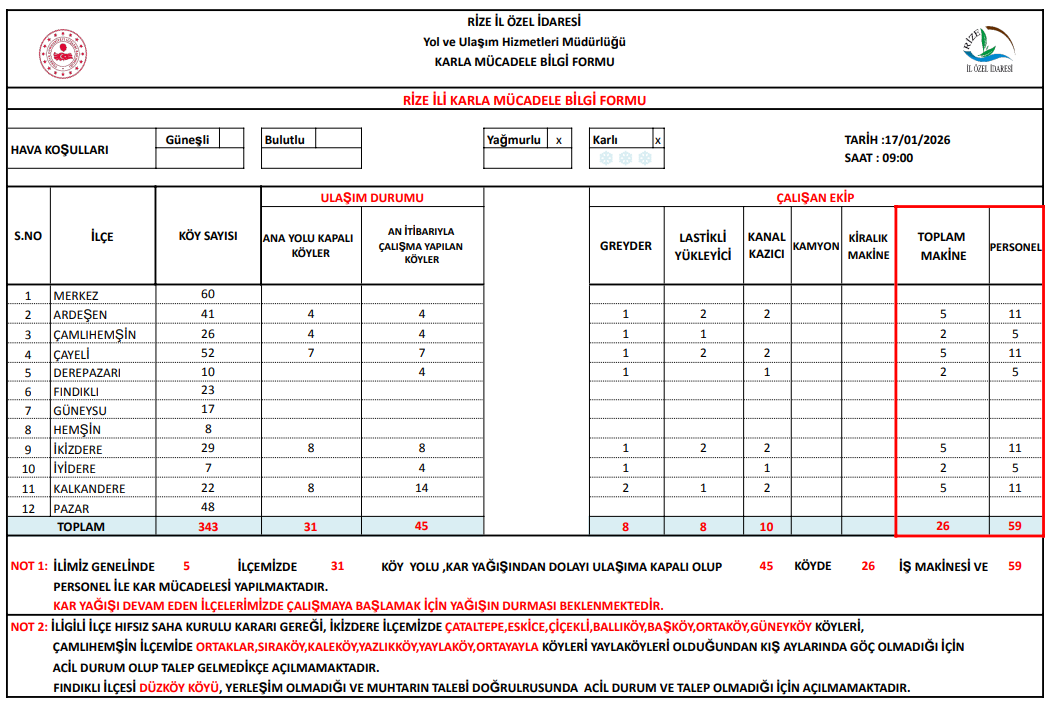 Kapanan yolların ilçelere göre dağılımı Ardeşen’de 4, Çamlıhemşin’de 4, Çayeli’de 7, İkizdere’de 8 ve Kalkandere’de 8 köy yolu şeklinde oldu.