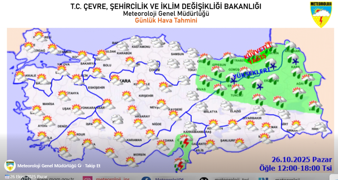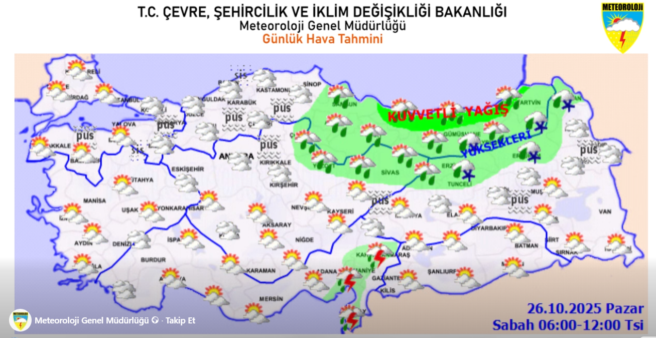 Meteoroloji Genel Müdürlüğü tarafından yayımlanan günlük hava tahmin raporuna göre, 26 Ekim 2025 Pazar günü Rize genelinde kuvvetli yağış bekleniyor. Sabah saatlerinden itibaren etkisini gösterecek yağışların, öğle saatlerinden sonra artarak sürmesi tahmin ediliyor.