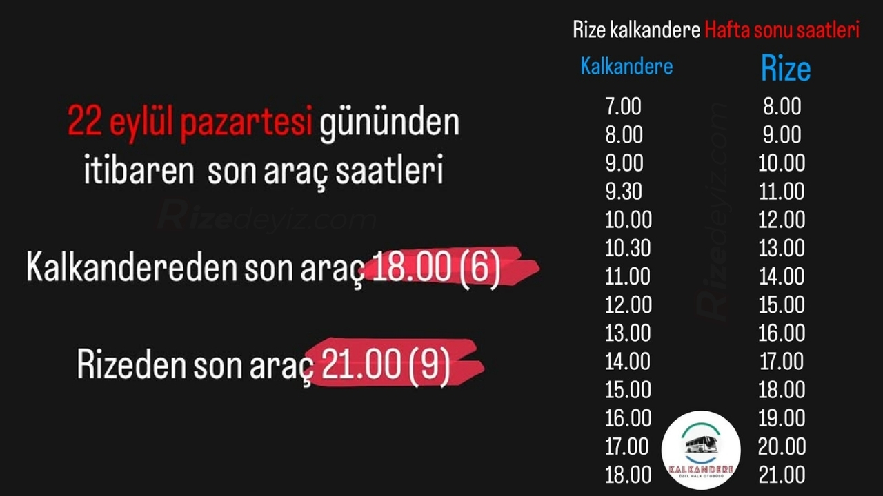 22 Eylül Pazartesi gününden itibaren Rize – Kalkandere hattında sefer saatlerinde değişikliğe gidildi. Yeni düzenlemeye göre Kalkandere’den son araç 18.00’de, Rize’den ise son araç 21.00’de hareket edecek.