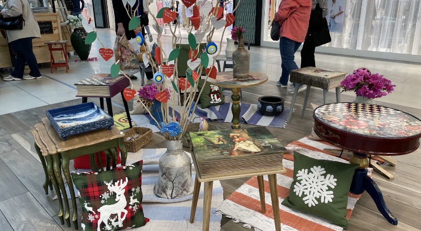 Kentteki bir alışveriş merkezinde, "Anneler Günü" kapsamında açılışı yapılan sergide, asırlık bir eve ait pencereden dönüştürülen tablolar, eski güğümlerden oluşturulan eserler, tepsiler, sehpalar, işleme yapılmış yastıklar, bez çantalar, kitap ayraçları, boyama yapılmış tabaklar yer alıyor.