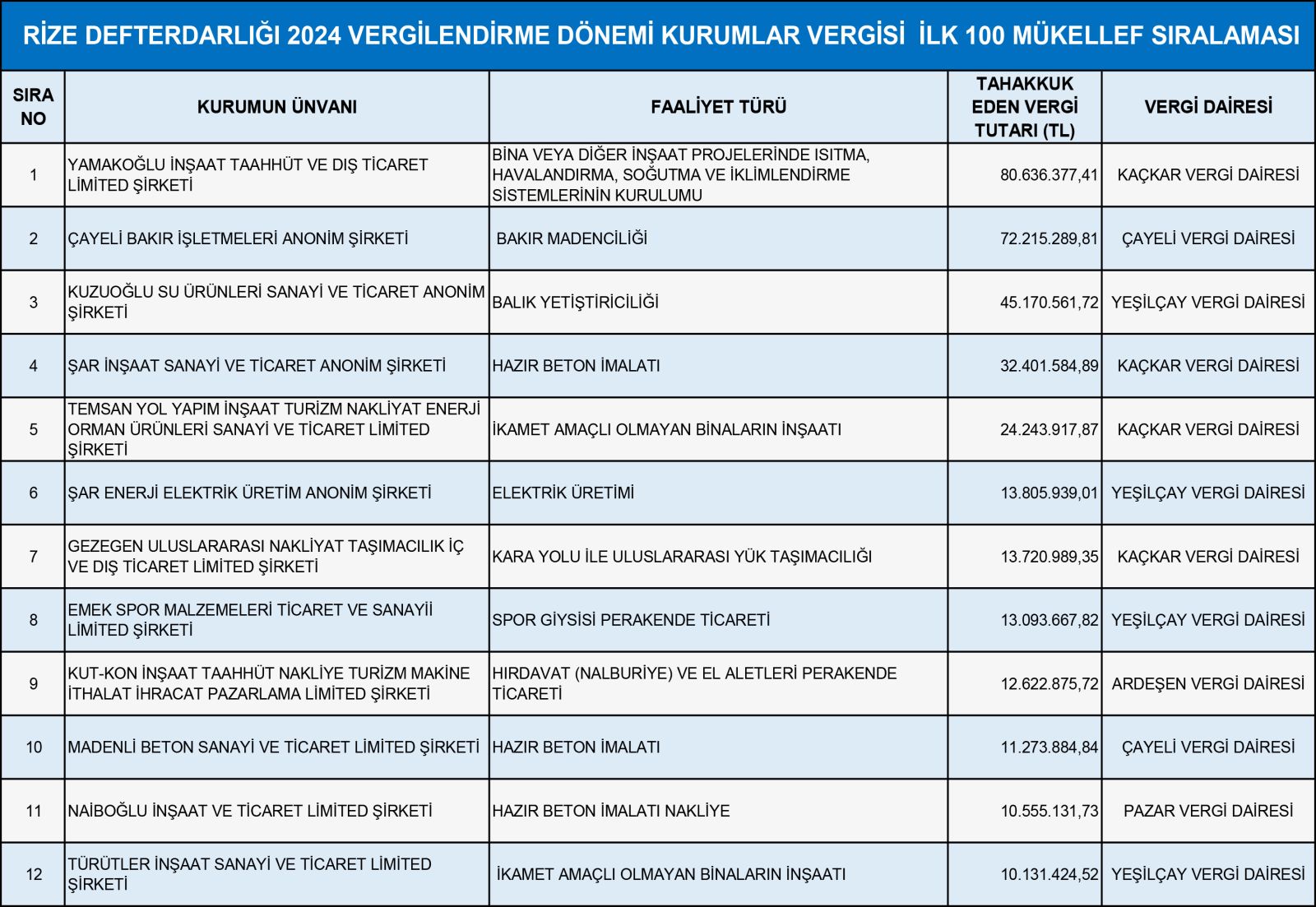 Rize Deftardarlığı, 'kurumlar vergisi' rekortmenlerini paylaştı.