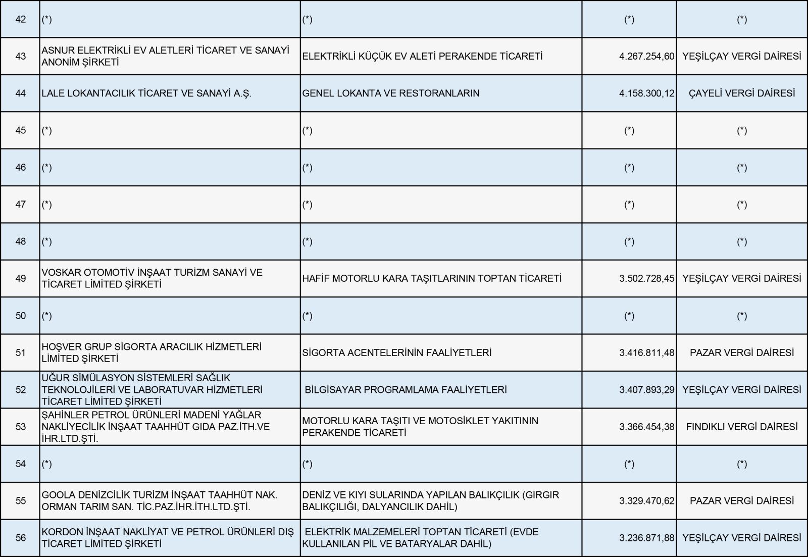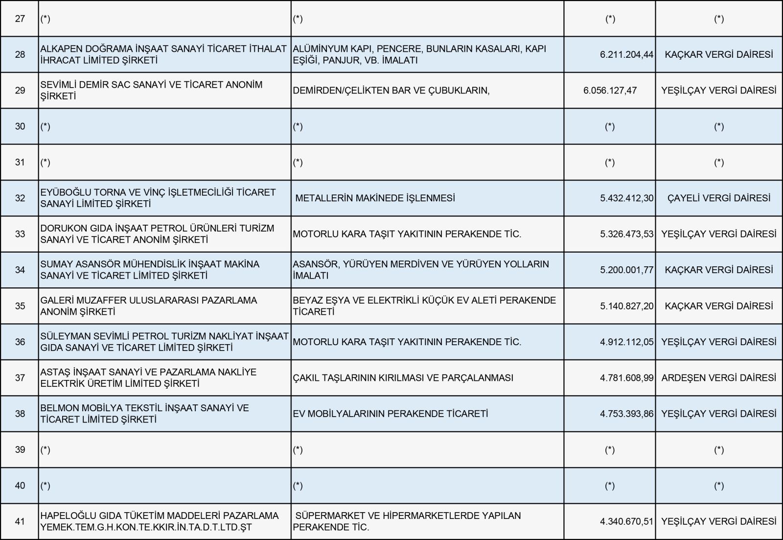 Çayeli Bakır İşletmeleri Anonim Şirketi 72 milyon 215 bin 289,81 TL ile ikinci, Kuzuoğlu Su Ürünleri Sanayi Ve Ticaret Anonim Şirketi 45 milyon 170 bin 561,72 TL ile üçüncü, Şar İnşaat Sanayi ve Ticaret Anonim Şirketi 32 milyon 401 bin 584,89 TL ile dördüncü ve Temsan Yol Yapım İnşaat Turizm Nakliyat Enerji Orman Ürünleri Sanayi Ve Ticaret Limited Şirketi 24 milyon 243 bin 917,87 TL ile beşinci sırada yer aldı.