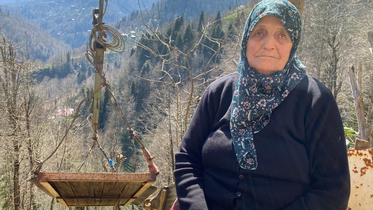 Rize'de Kaptanpaşa köyünde yaşayan Makbule Bozkurt (82), araç yoluna 110 metre uzaklığındaki evine, yük taşımak için kurulan çelik telli teleferikle ulaşıyor.