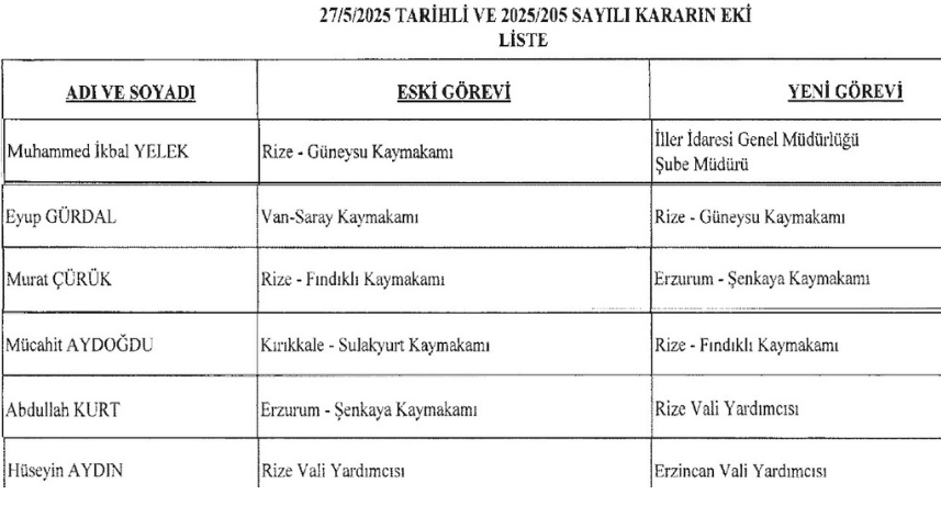 Ayrıca Rize Vali Yardımcısı Hüseyin Aydın, Erzincan Vali Yardımcılığı görevine atandı. Aydın'ın yerine Şenkaya Kaymakamı Abdullah Kurt, Rize Vali Yardımcısı olarak görevlendirildi.