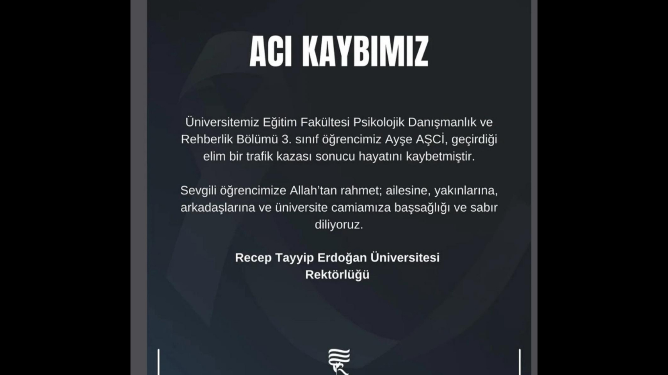 Recep Tayyip Erdoğan Üniversitesi Eğitim Fakültesi Psikolojik Danışmanlık ve Rehberlik Bölümü 3. sınıf öğrencisi Ayşe Aşçı, geçirdiği elim bir trafik kazasında hayatını kaybetti.