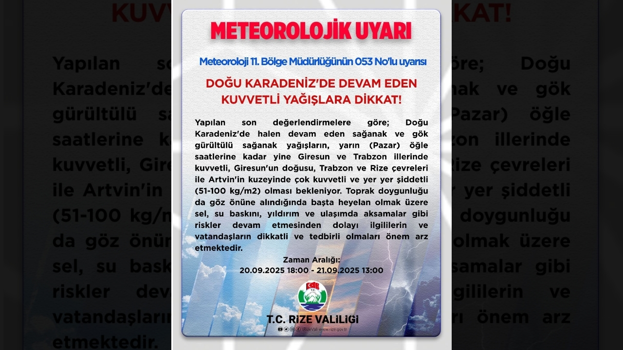 Meteoroloji, özellikle heyelan olmak üzere sel, su baskını, yıldırım ve ulaşımda aksamalar gibi olumsuzlukların yaşanabileceği konusunda uyarıda bulundu. Bu risklerin 20 Eylül 2025 Cumartesi günü saat 18.00'den, 21 Eylül 2025 Pazar günü saat 13.00'e kadar sürmesi bekleniyor.