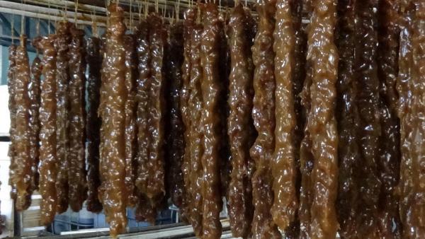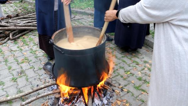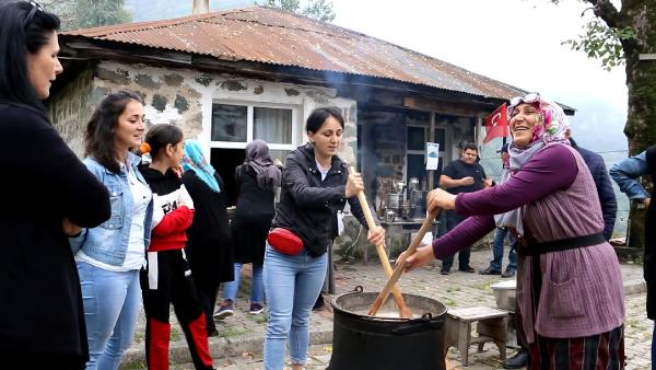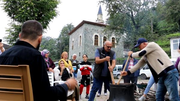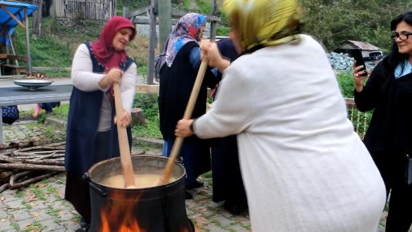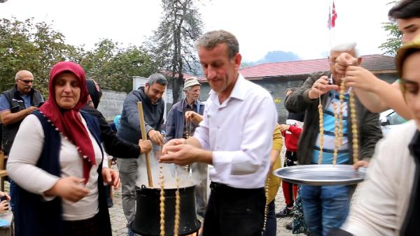 ARTVİN'in Arhavi ilçesinde 'imece' kültürünü yaşatan Dikyamaç köylüleri, bir araya geliyor, türküler eşliğinde dut, bal, süt, şeker ve un karışımı ile fındık ve ceviz katılarak kurutulduktan sonra elde edilen besin değeri yüksek köme yapıyor.
