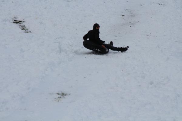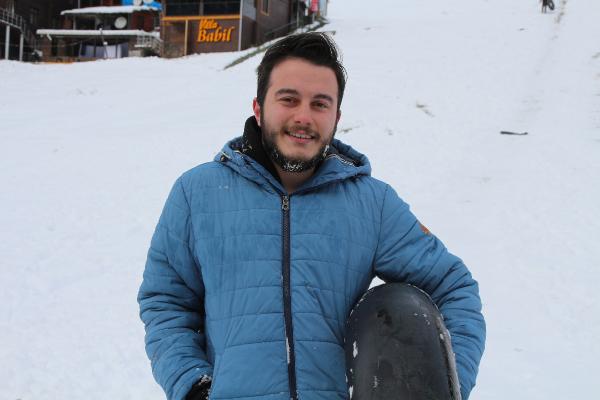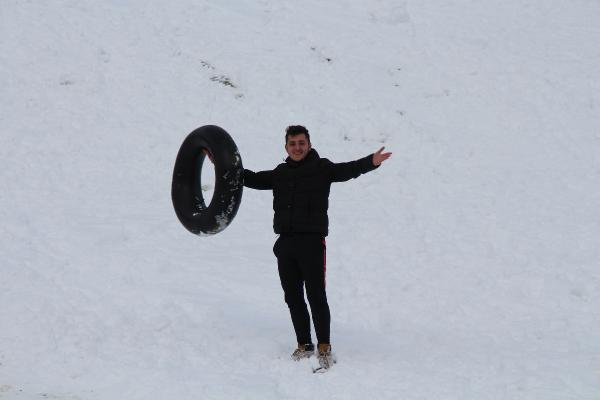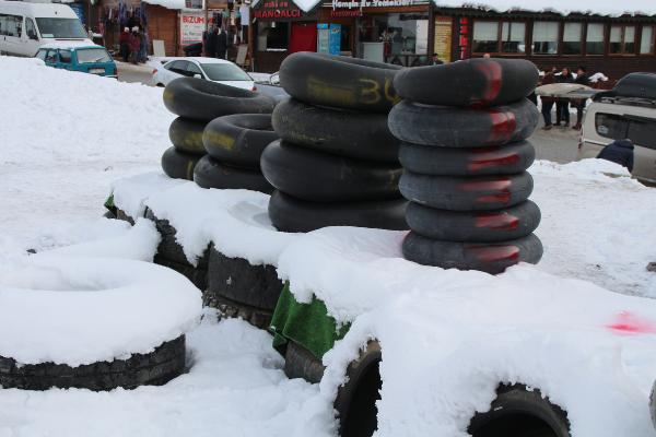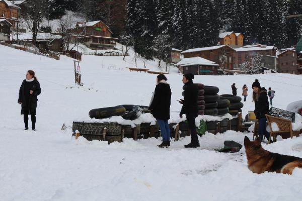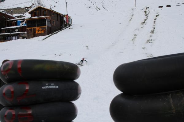 RİZE'nin Çamlıhemşin ilçesinin ünlü Ayder Yaylası, yağan karla beyaza büründü. Doğal parkurda şambrellerle rampadan kayanlar renkli görüntüler oluşturdu.