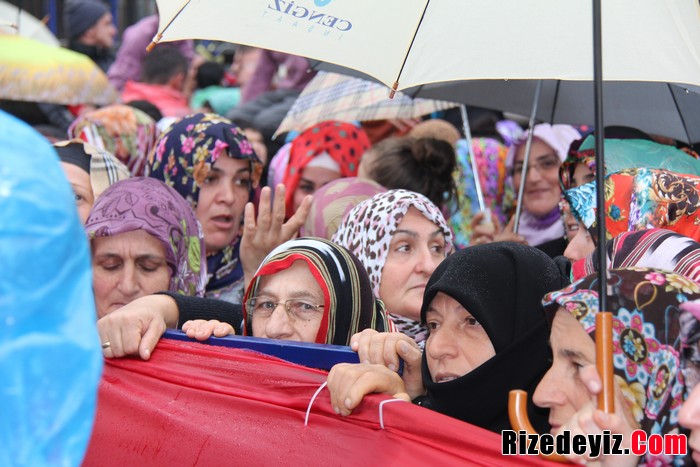Güneysu ilçesinde toplanan vatandaşlara kısa bir selamlama konuşması yapan Erdoğan, yağmur altında kendisine tezahüratta bulunan gençlerin yanına giderek onlarla tokalaştı.