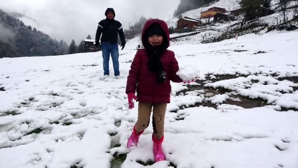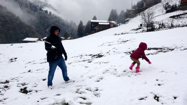 RİZE'nin Çamlıhemşin ilçesindeki, doğal güzelliği ve kaplıcalarıyla ünlü Ayder Yaylası, kar yağışıyla beyaza büründü. Hafta sonu tatili için yaylaya gelenler, çocuklarıyla birlikte kar topu oynadı, kar keyfi yaptı.