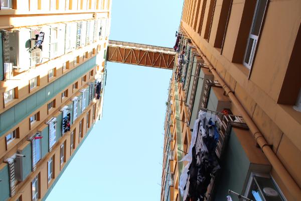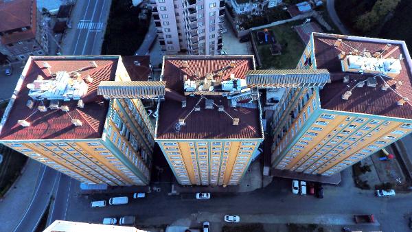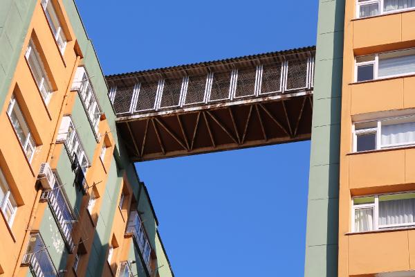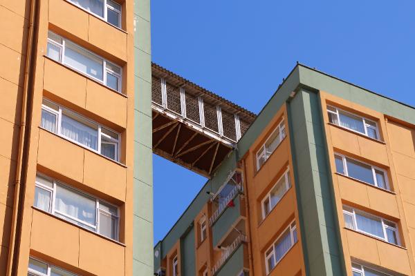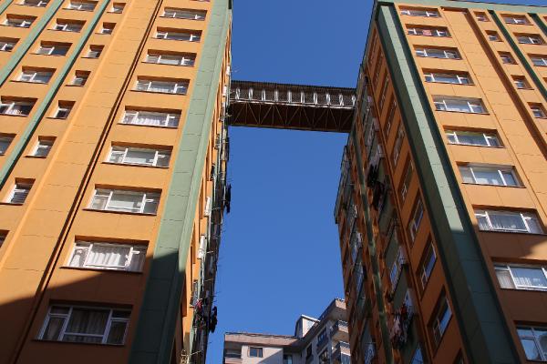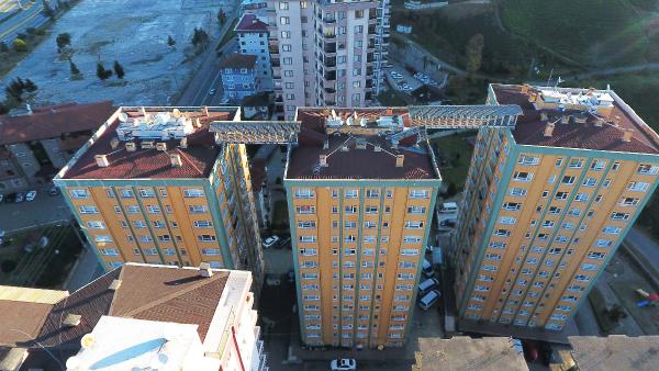 RİZE'de, 3 bloktan oluşan apartmanlar, çatı katlarına olası yangın durumunda kaçış yolu oluşturmak için kurulan demir köprülerle birbirine bağlandı. Apartmanda yaşayanlar, kestirme olduğu için yangın köprüsünü kullanarak, komşularına misafirliğe gidip, geliyor.