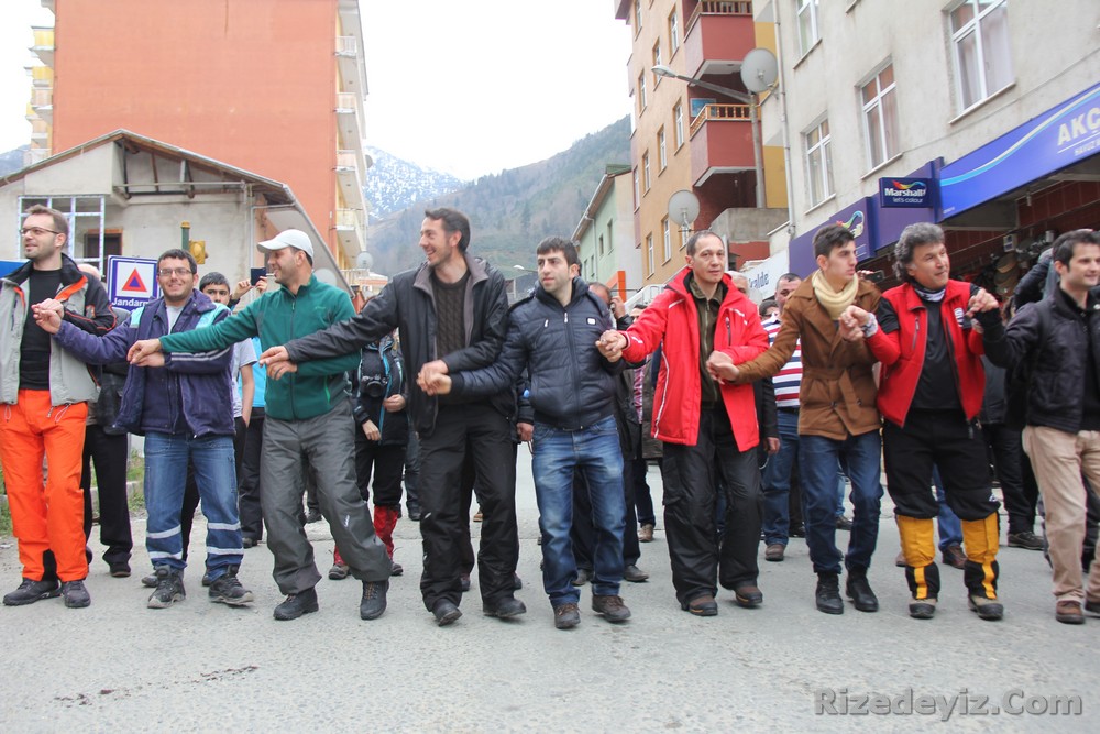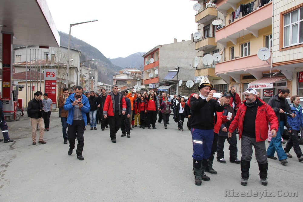 Gurup ilçe girişinde toplanarak tulum eşliğinde türküler söyledi ve belediye binası önüne geldi. Buradan araçlarla 2 bin metre yükseklikteki Demirkapı Köyünün üst kısımlarına çıkan grup kar yağışı sürprizi ile karşılaştı. Horonlar oynayan türküler söyleyen grup buradan yaya olarak Homeze Yaylasına doğru yürüyüşe geçti. Beş saat sürecek yürüyüşle yaylaya ulaşacak olan katılımcılar geceyi yayla evlerinde geçirdikten sonra yarın ilçeye dönecek.