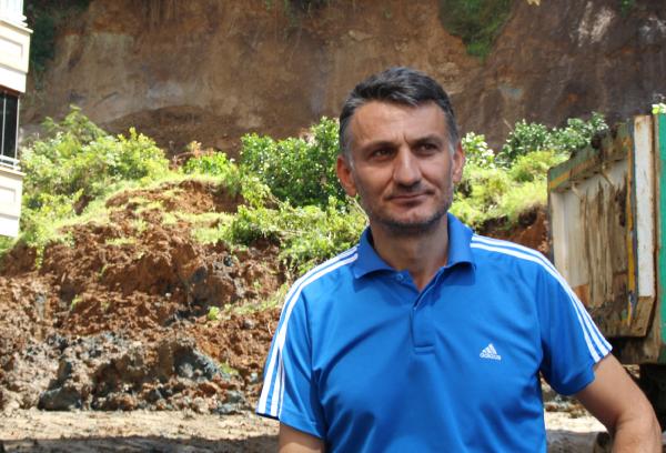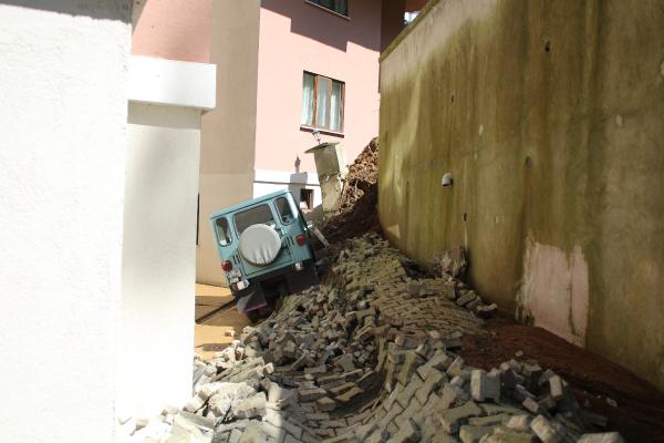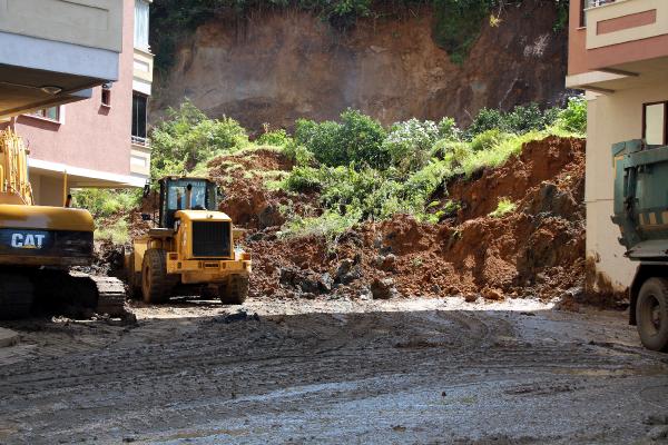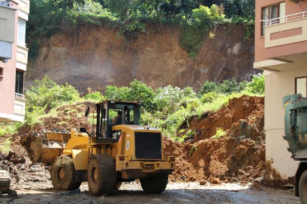 RİZE'de sağanak yağış sırasında meydana gelen heyelanda çöken istinat duvarının altında kalan 4 otomobile ulaşmak için çalışma yürütülüyor.