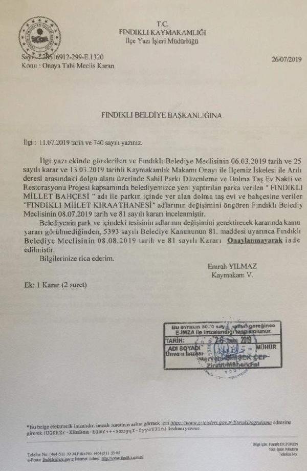 RİZE'nin Fındıklı ilçesinde 'Millet Bahçesi' olan parkın ismini '100'üncü Yıl Atatürk Parkı' olarak değiştiren belediyenin astığı tabelanın kaldırılmasının istendiği Kaymakamlık talimatı, yargıya taşındı.