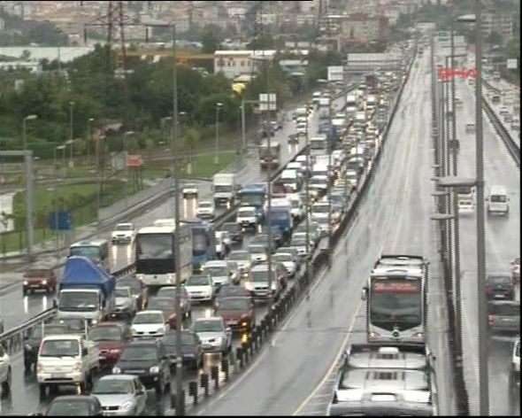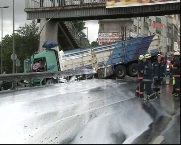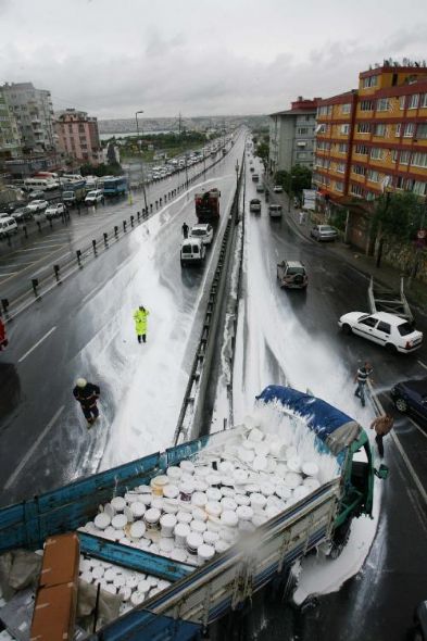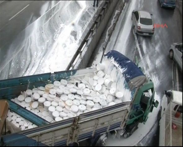 E-5 Karayolu İBB Sosyal Tesisleri Durağı İstanbul istikametinde bugün saat 10.30 sıralarında meydana gelen olay şöyle gelişti: Hadımköy`deki bir boya fabrikasından yüklediği 8 ton boyayı Rize`ye götüren Kerim Yılmaz, yoğun ya