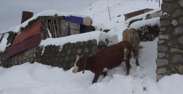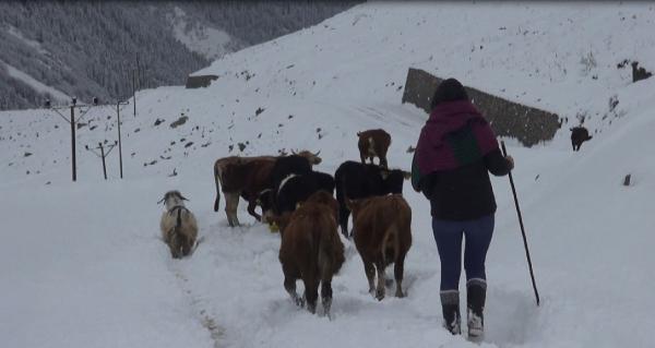 KARADENİZ'de, kar yağışı ile birlikte yaylalar, beyaz örtüyle kaplandı. Rize ve Trabzon'daki yaylalarda kara yakalanan yaylacılar ve çobanlar, sürüleriyle birlikte dönüşe geçti.