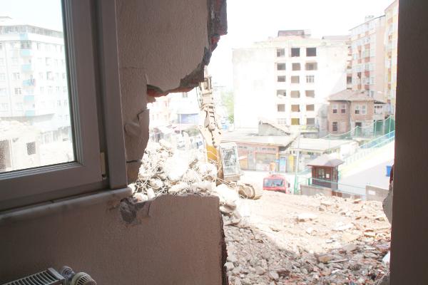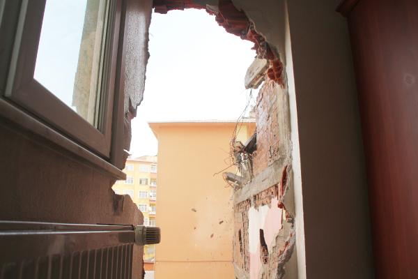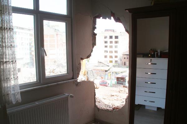Rize'de devam eden kentsel dönüşüm çalışması sırasında yıkımı yapılan binadan kopan beton parçaları, bitişikteki apartmanın duvarlarının delinmesine neden oldu. Yatak odasının içi molozla dolarken, yıkım sırasındaki sarsıntılar bina sakinlerini korkuttu.