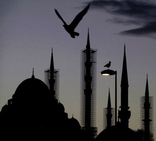 Ramazan ayında etrafı süsleyen mahya, Camii'nin iki minaresi arasına asılan ışıklı yazılardır.