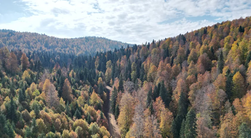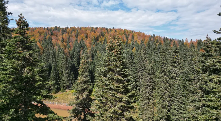 Bartın-Karabük sınırlarında bulunan 20 bin hektarlık alandaki 9 yaylada sonbaharla birlikte ağaçların sarı ve kahverenginin tonlarını almaya başlamasıyla ortaya çıkan manzara dronla görüntülendi.