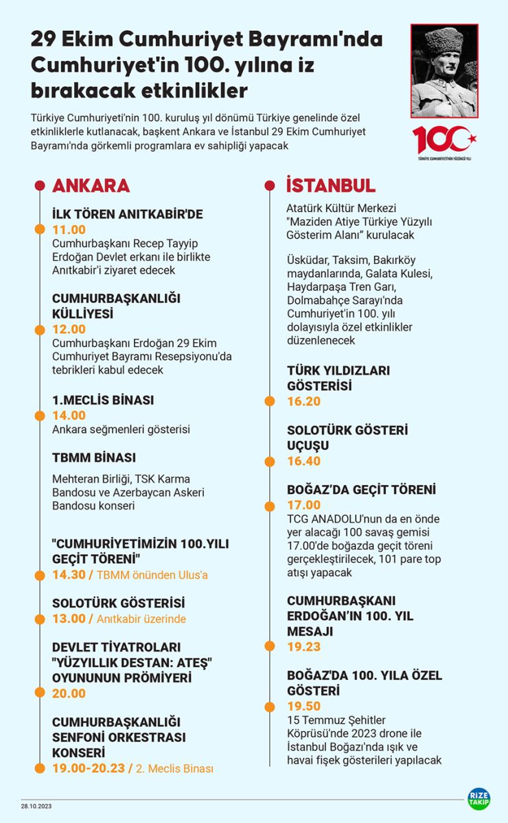 Türkiye Cumhuriyeti'nin kuruluşunun 100. yıl dönümü ülke genelinde özel etkinliklerle kutlanacak. Başkent Ankara ve İstanbul, 29 Ekim Cumhuriyet Bayramı'nda görkemli programlara ev sahipliği yapacak.