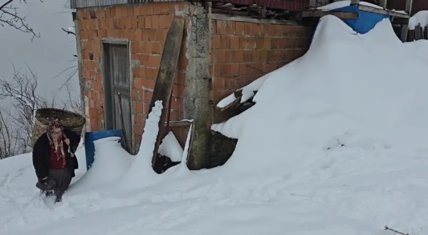 Zonguldak'ın Alaplı ilçesine bağlı, 900 rakımlı Gümeli beldesinde yaşayan vatandaşlar, yarım metreyi bulan kar yağışı altında hayvancılık yapmaya devam ediyor.