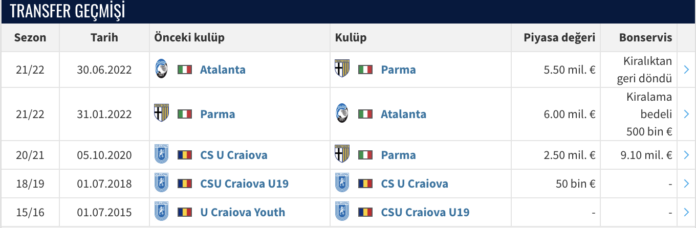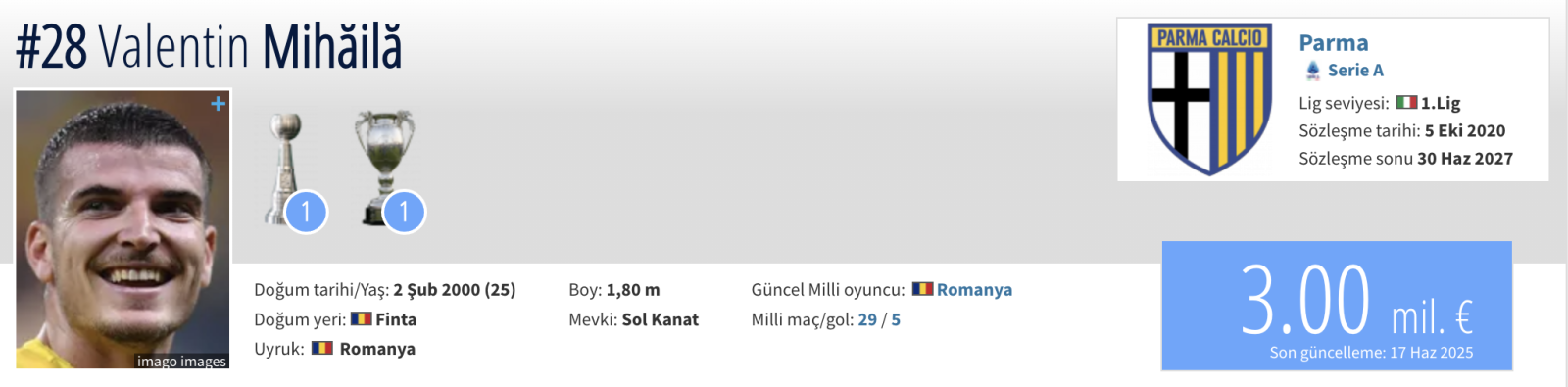 Valentin Mihaila, 2020 yılında Universitatea Craiova’dan Parma’ya 9.1 milyon Euro karşılığında transfer olmuştu. Geçtiğimiz sezon Serie A'da 21 maça çıkan Rumen oyuncu, 3 asistle oynadı.