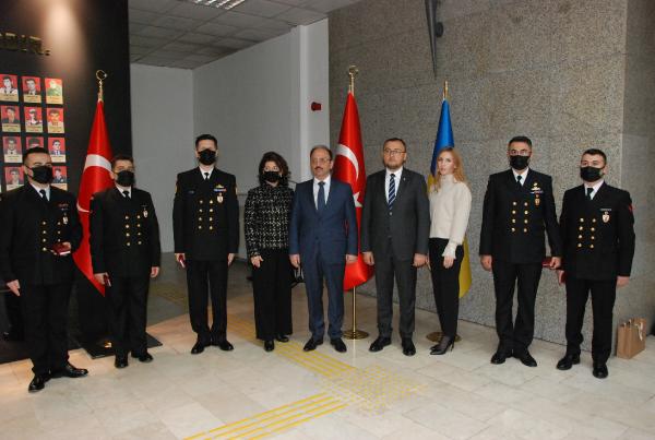 BARTIN'da Ukrayna Büyükelçisi Vasyl Bodnar, 1 yıl önce İnkum açıklarında batan kuru yük gemisindeki 6 personeli kurtaran Sahil Güvenlik Komutanlığı personeline madalya verdi.