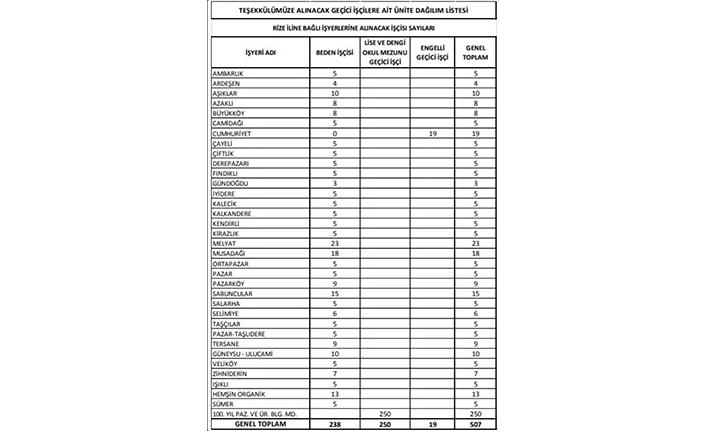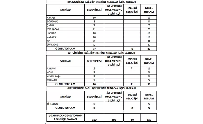 Çay İşletmeleri Genel Müdürlüğü Rize, Trabzon, Artvin ve Giresun İllerinde işçi ihtiyacı bulunan yaş çay fabrikalarımıza 350 geçici beden işçisi (tahmil tahliye); Rize Cumhuriyet Çay Fabrikasına 19 engelli geçici işçi, Artvin Arhavi Çay Fabrikasına 11 engelli geçici işçi; 100. Yıl Pazarlama ve Üretim Bölge Müdürlüğüne 250 lise ve dengi okul mezunu teknik kariyerli geçici işçi olmak üzere toplamda 630 işçi alımı yapacağını açıkladı. En az ilkokul mezunu adaylar arasından istidam sağlayacak ÇAYKUR, başvuru şartlarını taşıyan ve başvuruda bulunanları noter huzurunda çekilecek kuraya dahil edecek. Ayrıca yayınlanan ilan ile başvuru şartlarından tarihine kadar merak edilen tüm detaylara yer verildi. İşte başvuru şekli...