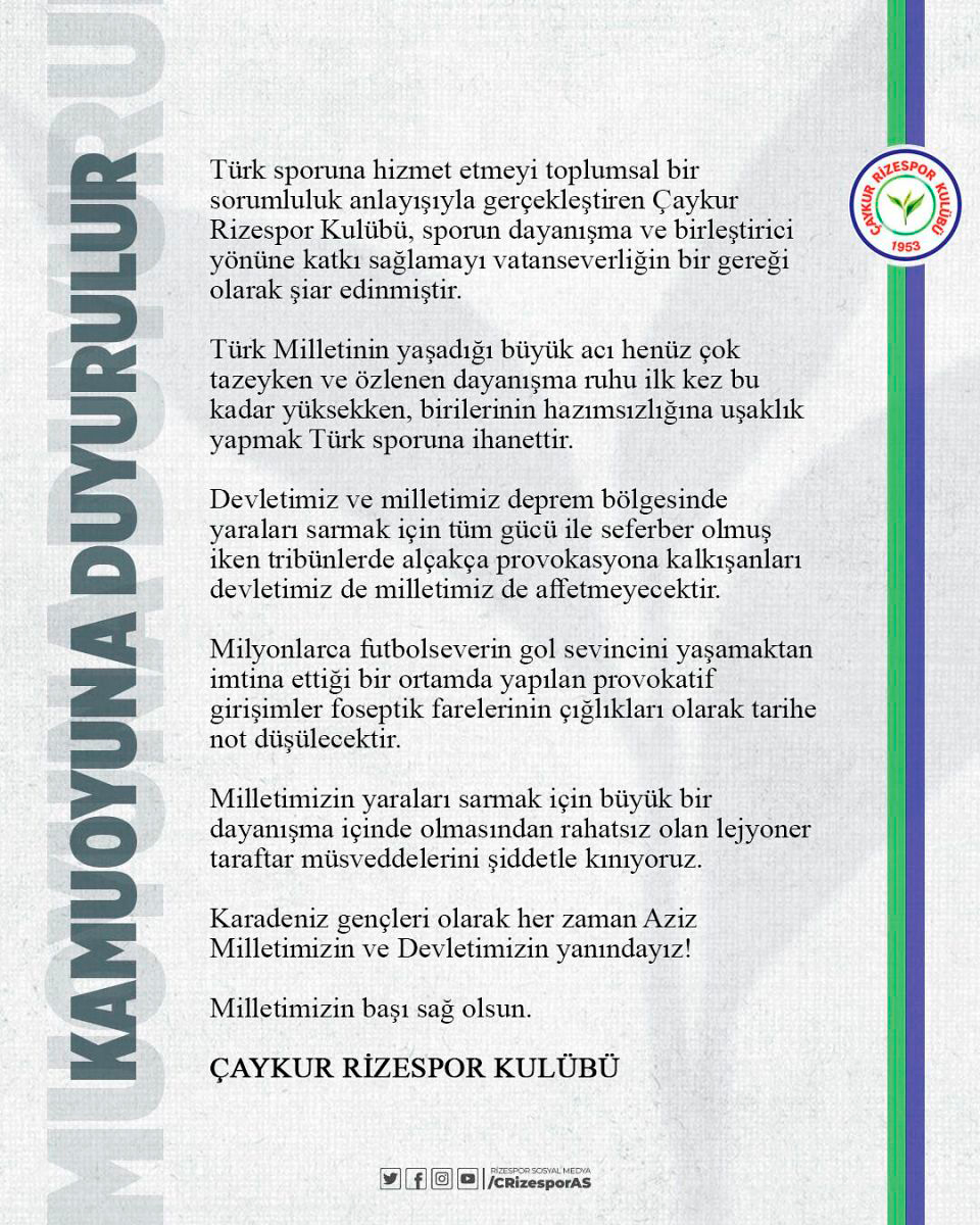 Süper Toto 1. Lig ekiplerinden Çaykur Rizespor'dan yapılan yazılı açıklamada;" Türk Milletinin yaşadığı büyük acı henüz çok tazeyken ve özlenen dayanışma ruhu ilk kez bu kadar yüksekken, birilerinin hazımsızlığına uşaklık yapmak Türk sporuna ihanettir. Devletimiz ve milletimiz deprem bölgesinde yaraları sarmak için tüm gücü ile seferber olmuş iken tribünlerde alçakça provokasyona kalkışanları devletimiz de milletimiz de affetmeyecektir. Milyonlarca futbolseverin gol sevincini yaşamaktan imtina ettiği bir ortamda yapılan provokatif girişimler foseptik farelerinin çığlıkları olarak tarihe not düşülecektir. Milletimizin yaraları sarmak için büyük bir dayanışma içinde olmasından rahatsız olan lejyoner taraftar müsveddelerini şiddetle kınıyoruz. Karadeniz gençleri olarak her zaman Aziz Milletimizin ve Devletimizin yanındayız! Milletimizin başı sağ olsun" ifadelerine yer verildi.