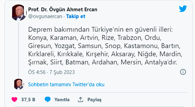 “Deprem bakımından Türkiye’nin en güvenli illeri: Konya, Karaman, Artvin, Rize, Trabzon, Ordu, Giresun, Yozgat, Samsun, Sinop, Kastamonu, Bartın, Kırklareli, Kırıkkale, Kırşehir, Aksaray, Niğde, Mardin, Şırnak, Siirt, Batman, Ardahan, Mersin, Antalya’dır.