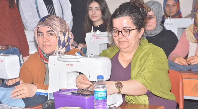 Kalkandere Halk Eğitim Merkezi'nde Kahramanmaraş merkezli depremlerden etkilenen bölgelere gönderilmek üzere kışlık giysiler dikiyor.