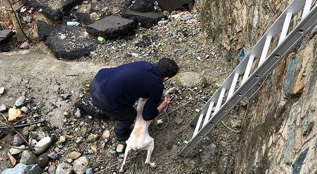 Edinilen bilgiye göre, bir köpek Rize'nin Pazar ilçesinde bulunan dere yatağına düştü. Dere yatağına düşen köpeği gören vatandaşlar durumu itfaiye ekiplerine haber verdi. İhbar üzerine bölgeye giden itfaiye ekipleri ve Pazar Belediyesi zabıta ekipleri, köpeği bulunduğu yerden çıkartmak için çalışma başlattı. Yaklaşık 10 metrelik dere yatağına merdiven yardımıyla inen ekipler, yaklaşık 1 saatlik çalışma sonucu köpeği kucağına alarak mahsur kaldığı yerden çıkardı.
